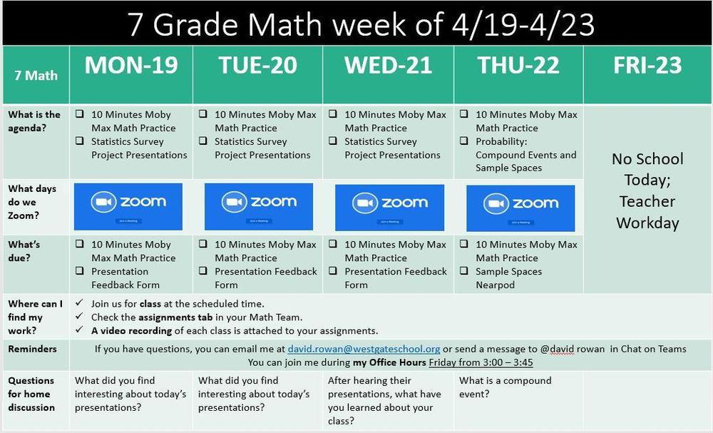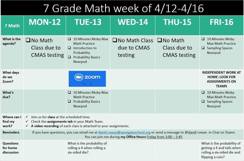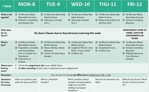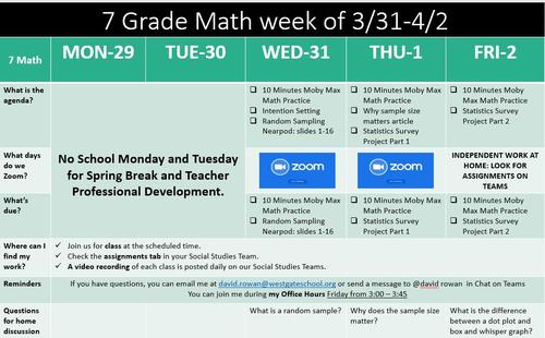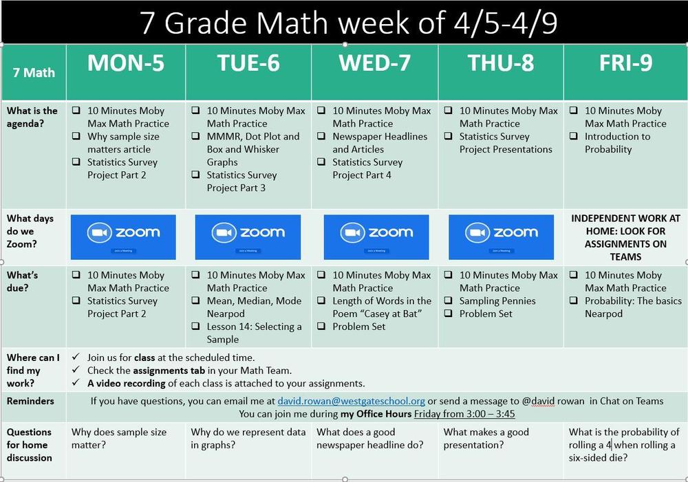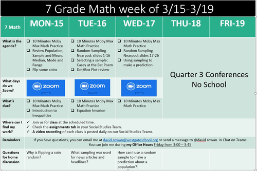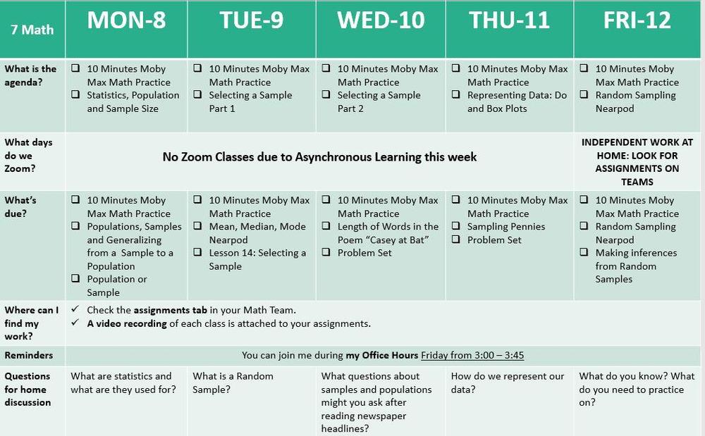 Here is our Weekly Update for Math. This week we will be starting a new unit on Statistics and Probability. We will begin with statistics, population and sample, types of samples, selecting a sample and representing the data. I will be available Friday to answer emails and help students.