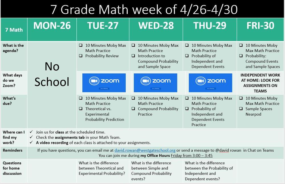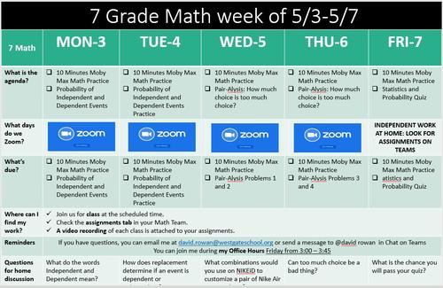 Here is our schedule for the week. We will be finishing up our unit on Probability by learning about Independent and Dependent events and answering the question: Is too much choice a bad thing? There will be a quiz on statistics and probability on Friday.