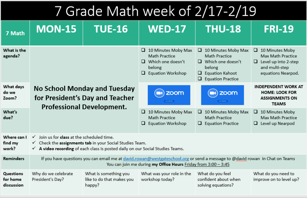 I want to remind everyone that we do not have school on Monday or Tuesday. On Wednesday, we will continue working on levels of solving equations with the goal of leveling up again on Friday.