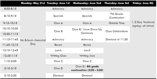 Tuesday - Thursday: Math A meets at 8:15 and Math B meets at 10:15