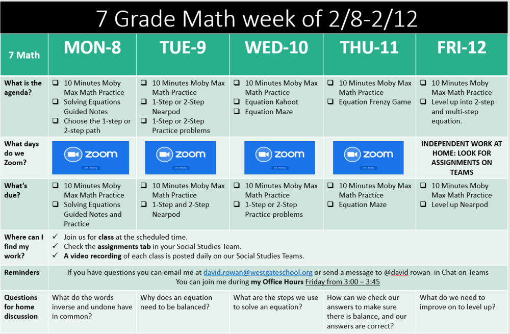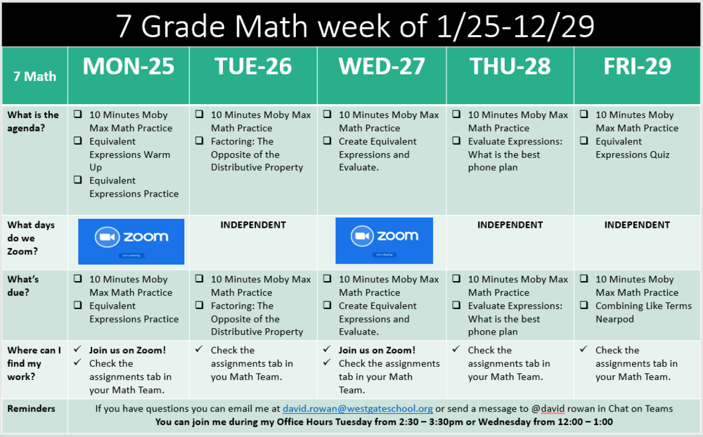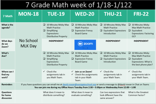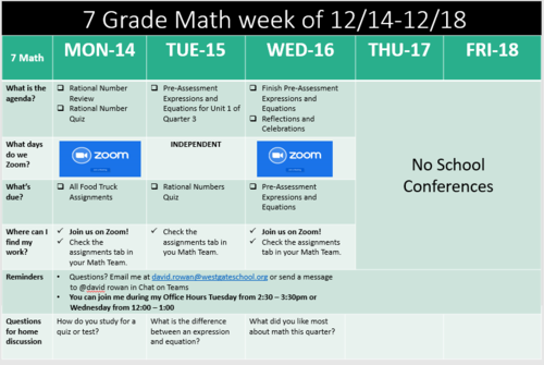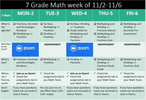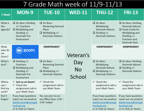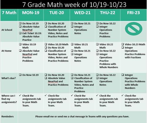 Hi 7th graders! Mr. Rowan here! Check out this week's schedule in Math. We are going to be spending the week using what we learned about multiplying and dividing positive and negative numbers and apply that to multiplying and dividing positive and negative fractions.