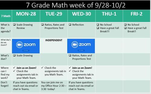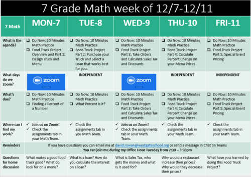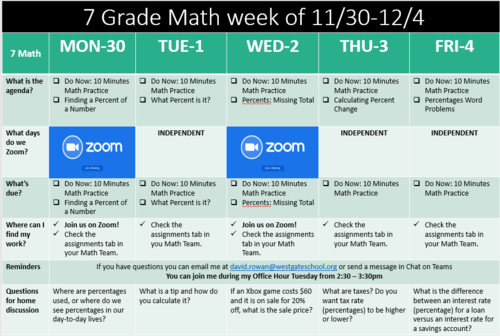 Here is the 10.23 Weekly Update for Math. I look forward to seeing everyone on Zoom next week! Depending where each student is at they will be practicing operations with integers Monday and Tuesday, or they will be learning about Irrational Numbers and Exponents. For the rest of the week we will all be working on converting decimals, percents and fractions.