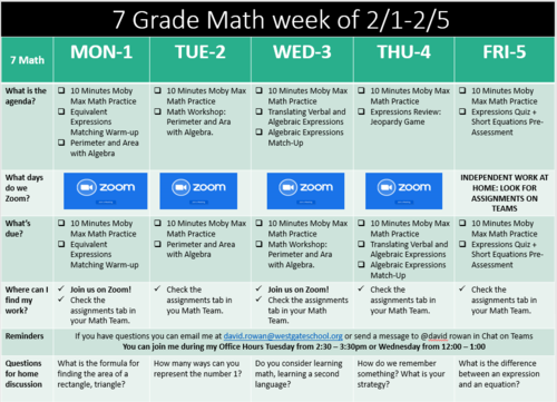 Here is our schedule for next week. We will be focusing on equivalent expressions and there will be a quiz on Friday covering what we have done so far this quarter.